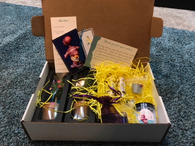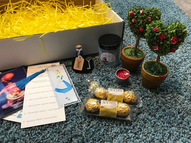 Display Thoughts: Your Alice will think she's back in Wonderland - included in this great box are two "Painting the roses red" trees, a sweet paint bucket and a "Drink Me" potion and key. There is also an Alice bookmark for you, plus some Fizzy Bath Salts to help make YOUR night complete and add a bit of pampering to your life. Please note that these are all hand-crafted items. Each item may be slightly different than as shown.