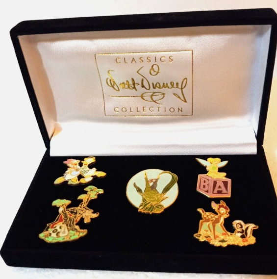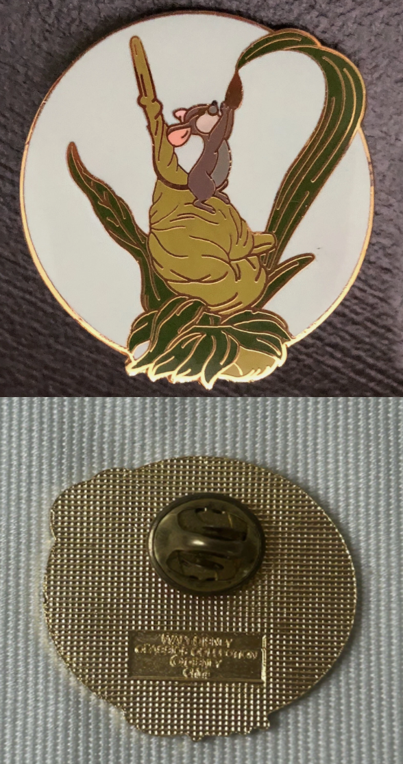 One of the five pins listed in the alternate set of pins commemorating the retired 1st Limited Edition WDCC Sculptures. This set replaced the Cinderella dress pin with the Fieldmouse. This set was often given as a gift with purchase. Approx. 1.25".