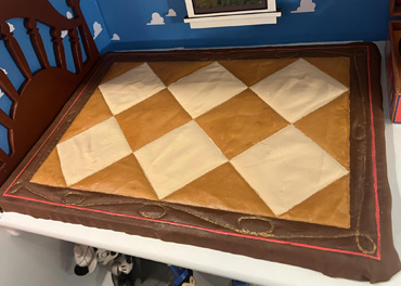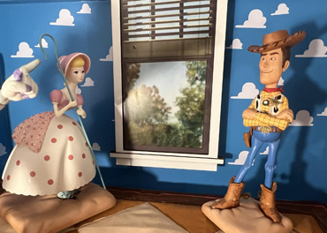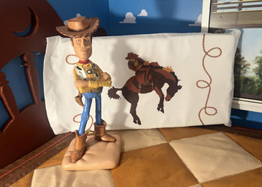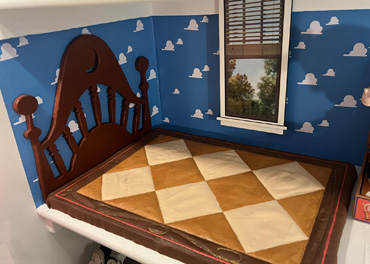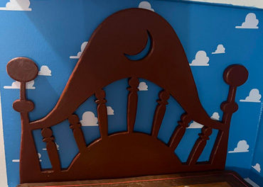 Andy's Bed set has three pieces. A bed, headboard with double-sided tape for attaching to the wall, and a cloth pillow.