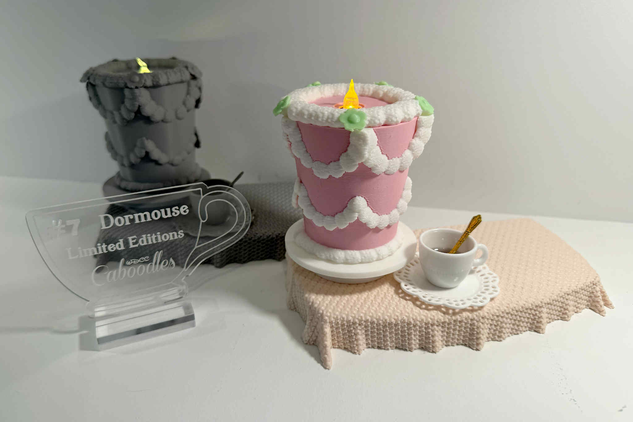 🎉 A toast to nonsense and nap time! 🫖 Our Dormouse has officially arrived at the table — his scene completed with the table, a twinkling un-birthday cake and a perfectly poured cup of tea.