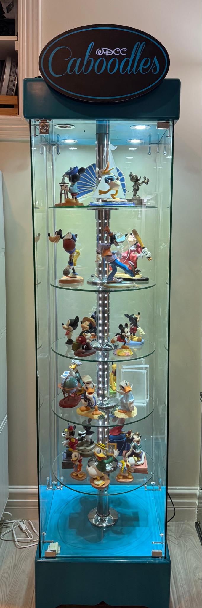 Five of these rotating displaly cabinets were created by WDCC Caboodles. Each locking cabinet featured 5 glass shelves and a WDCC Lightbox on the top.
