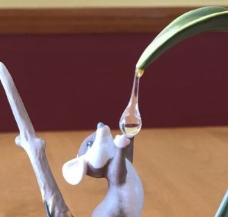 To avoid breakage the dewdrop was lengthened to touch first one paw, and eventually, touching both paws.