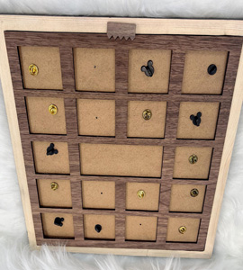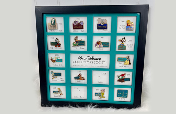 This frame shown features a translucent blue acrylic frame. The dates and name of each of the annual membership pins are laser engraved onto the wood backing. There is a hole in the appropriate place for inserting your pins.