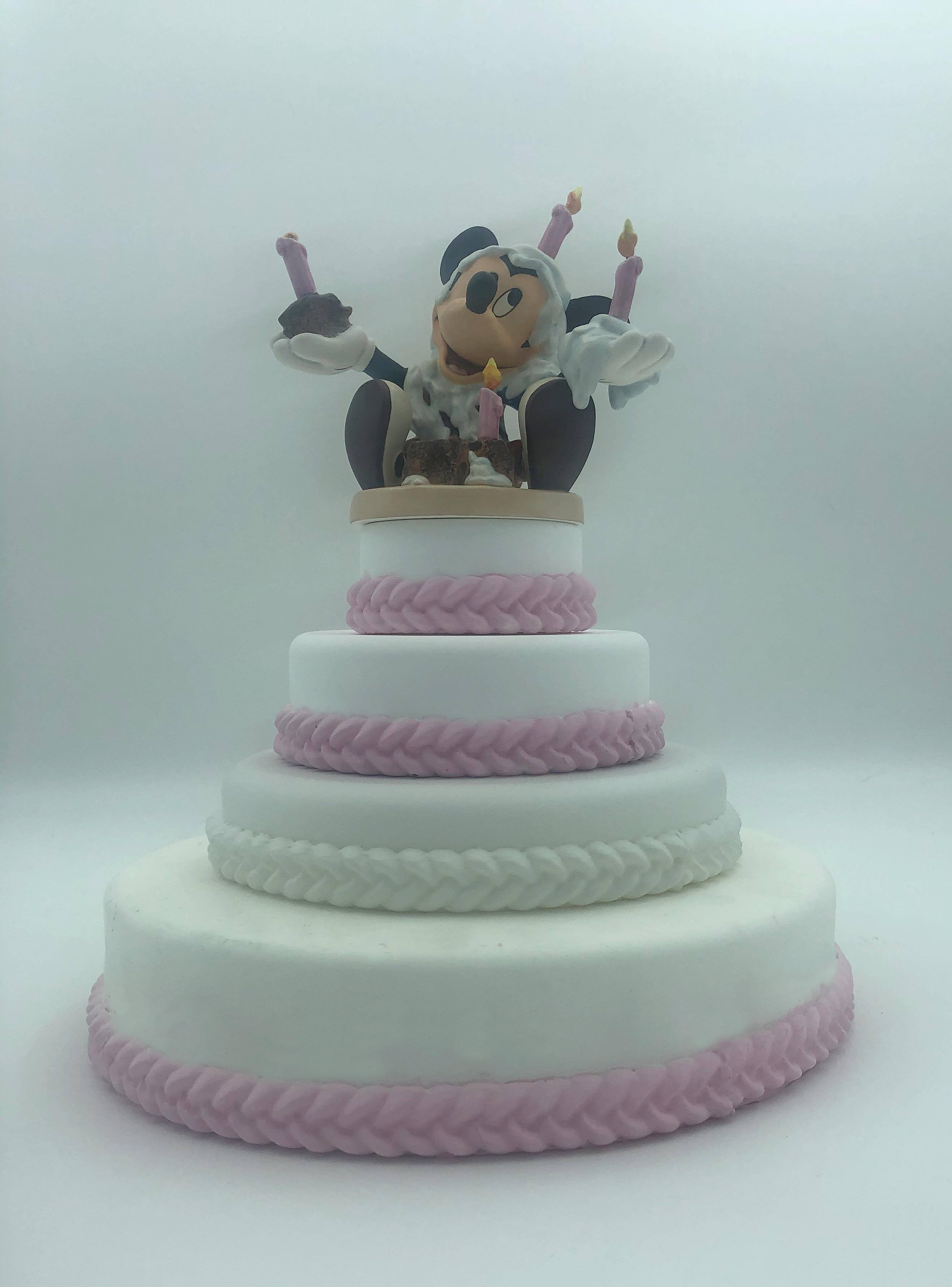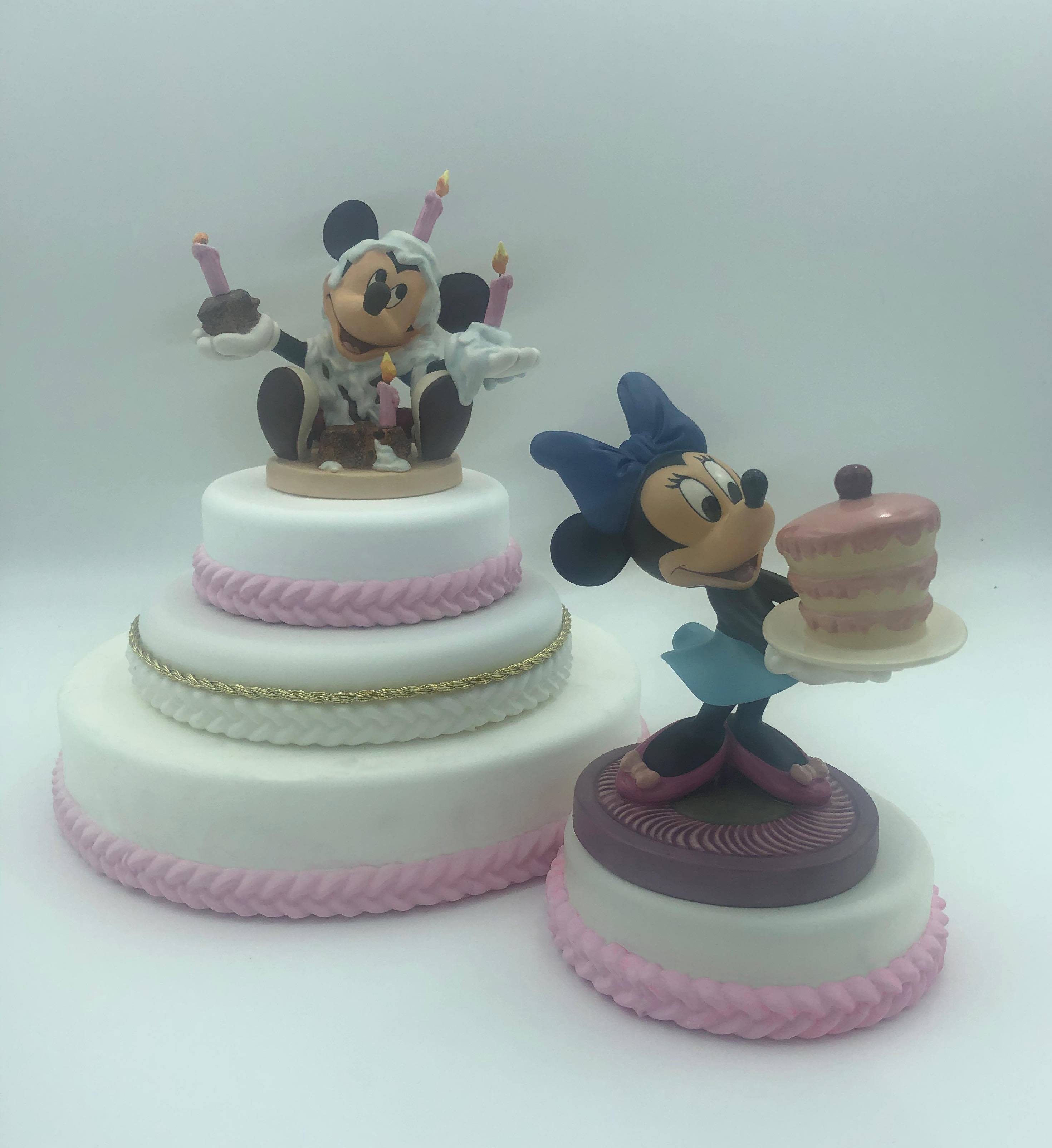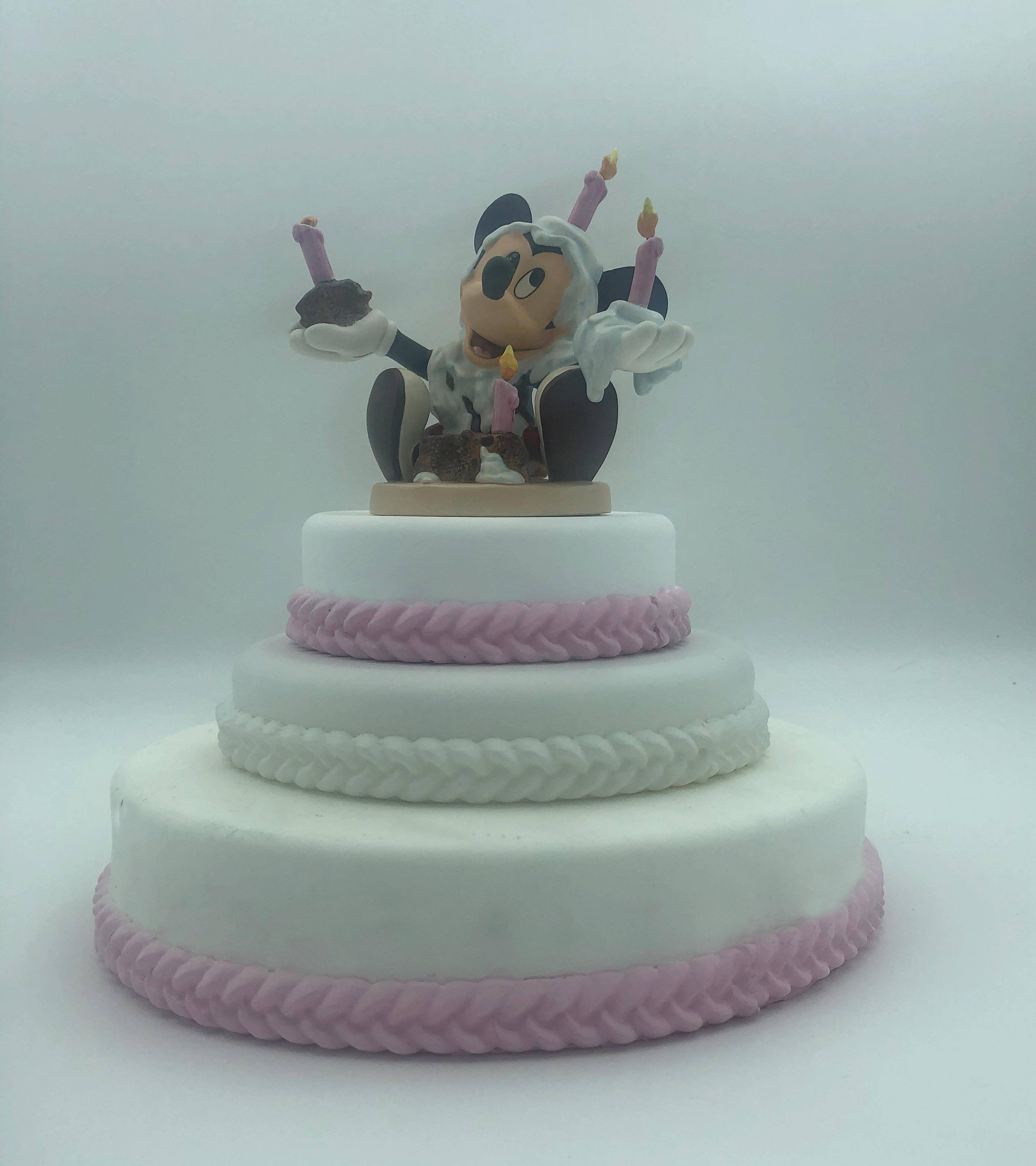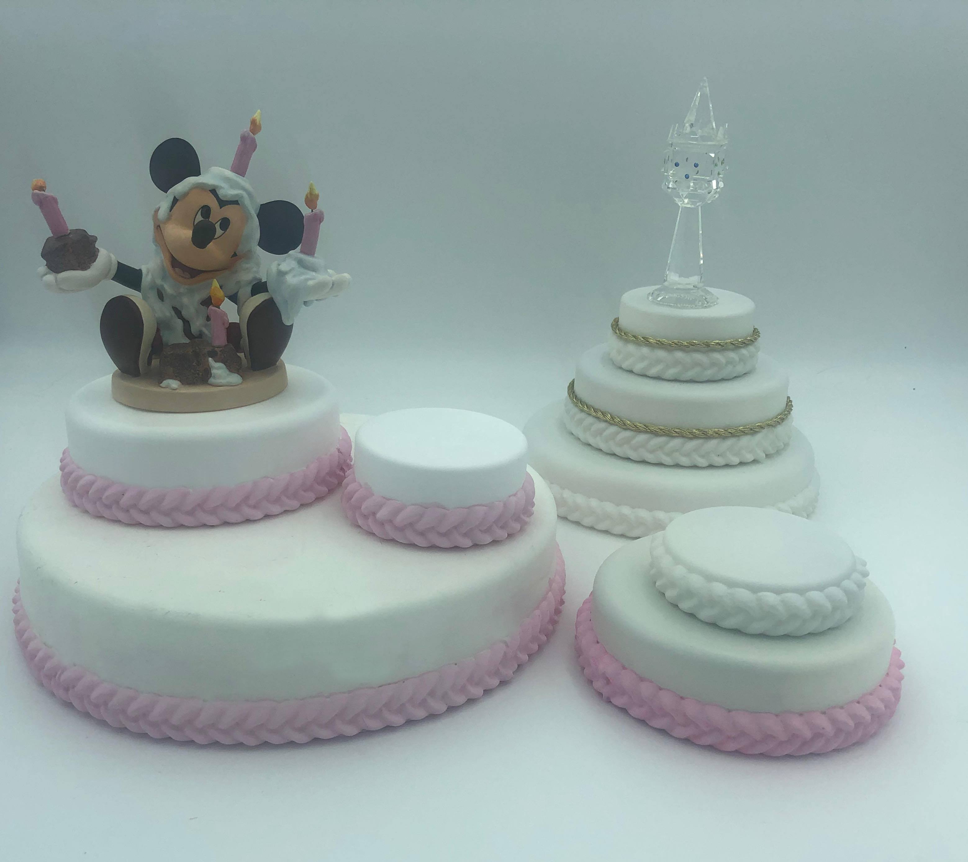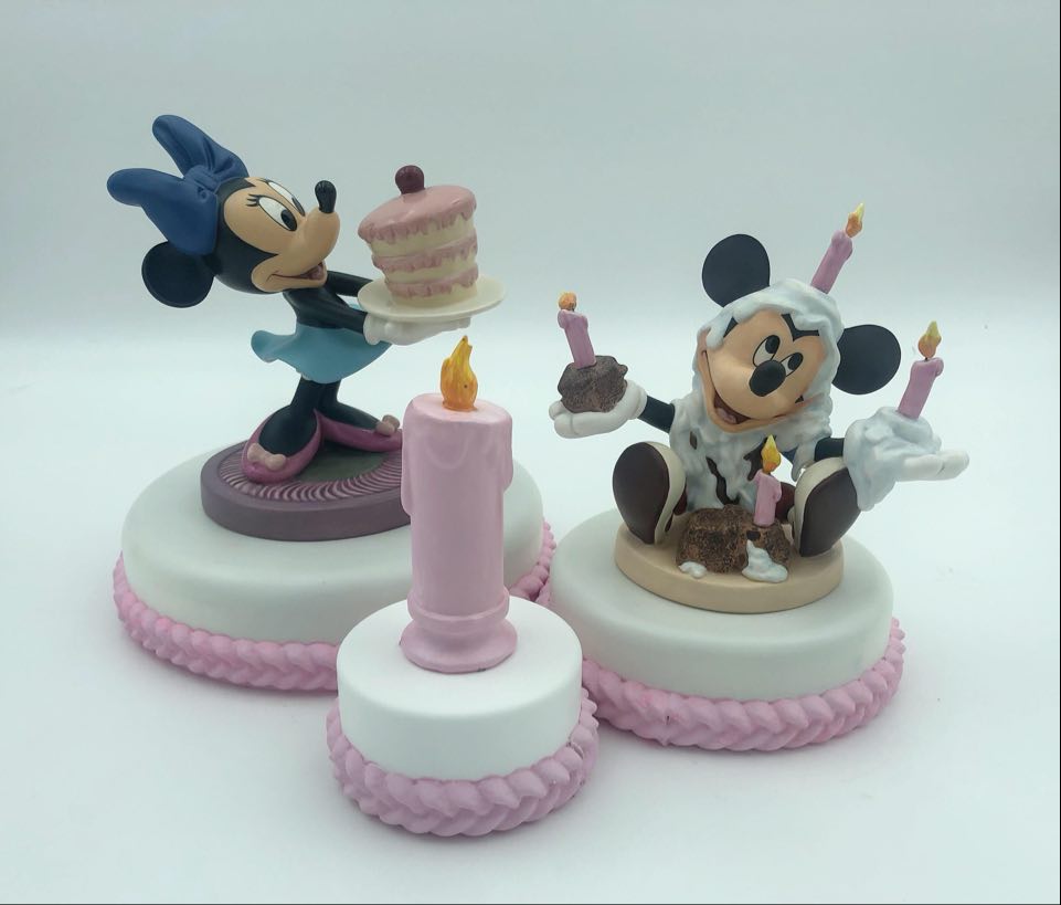 Display Thoughts: This beautiful resin cake and stand looks wonderful with the WDCC Cinderella cake toppers. The small cake is a great place to display your WDCC crystal. The birthday cake fits perfectly with Mickey and Minnie Mouse and can be ordered in with white or pink frosting color.