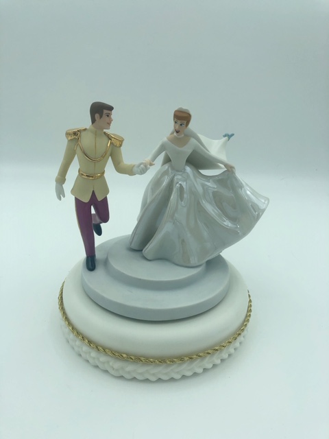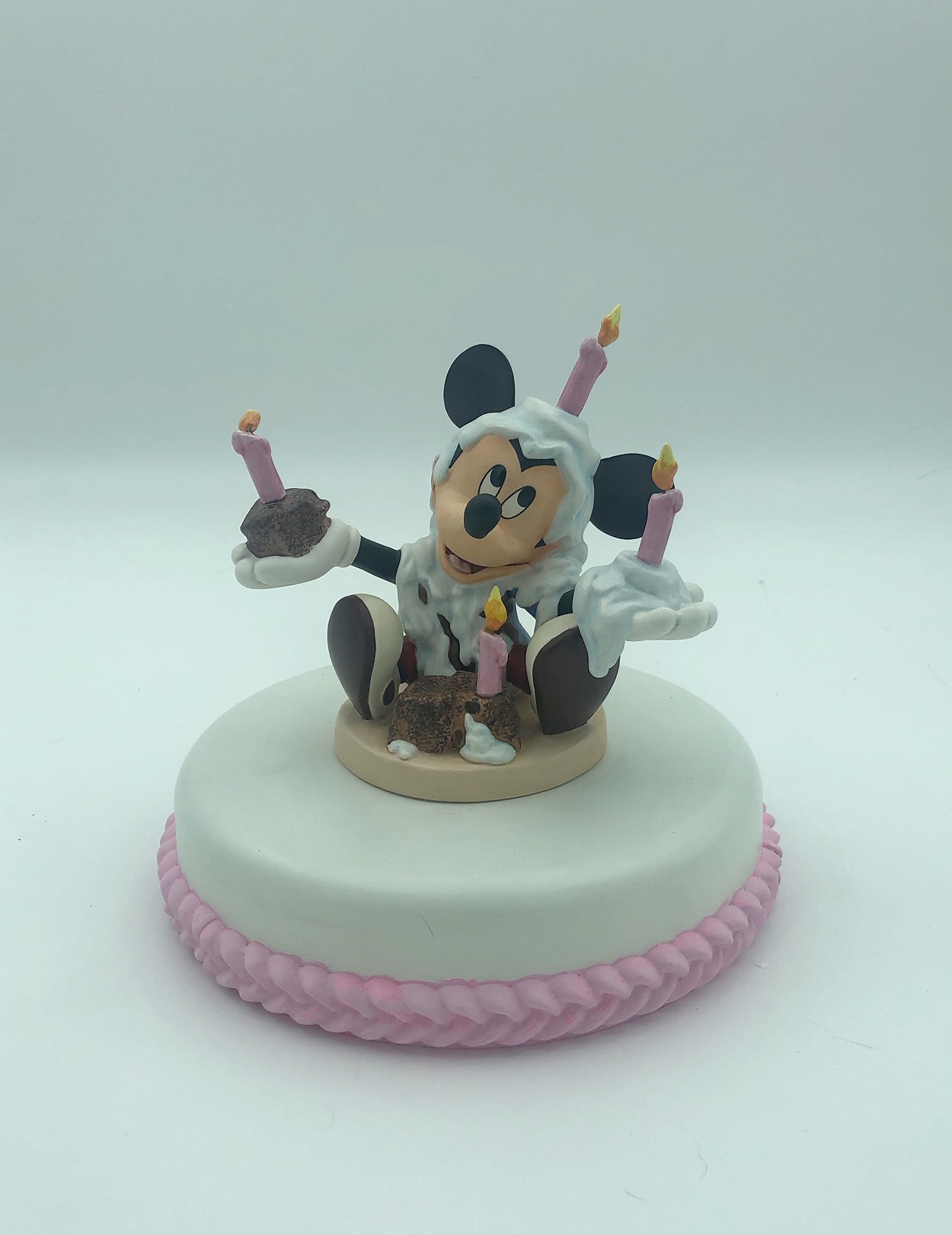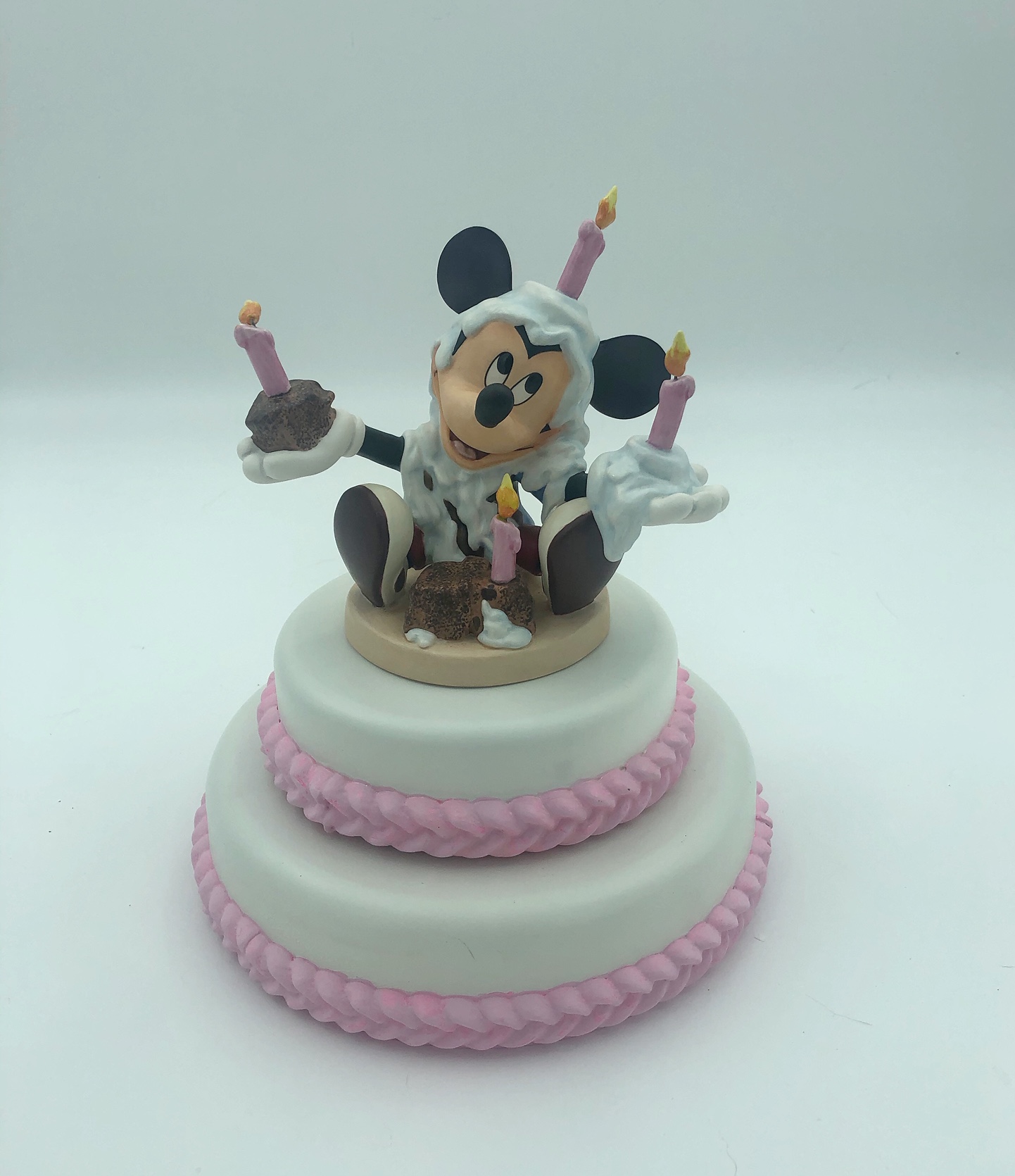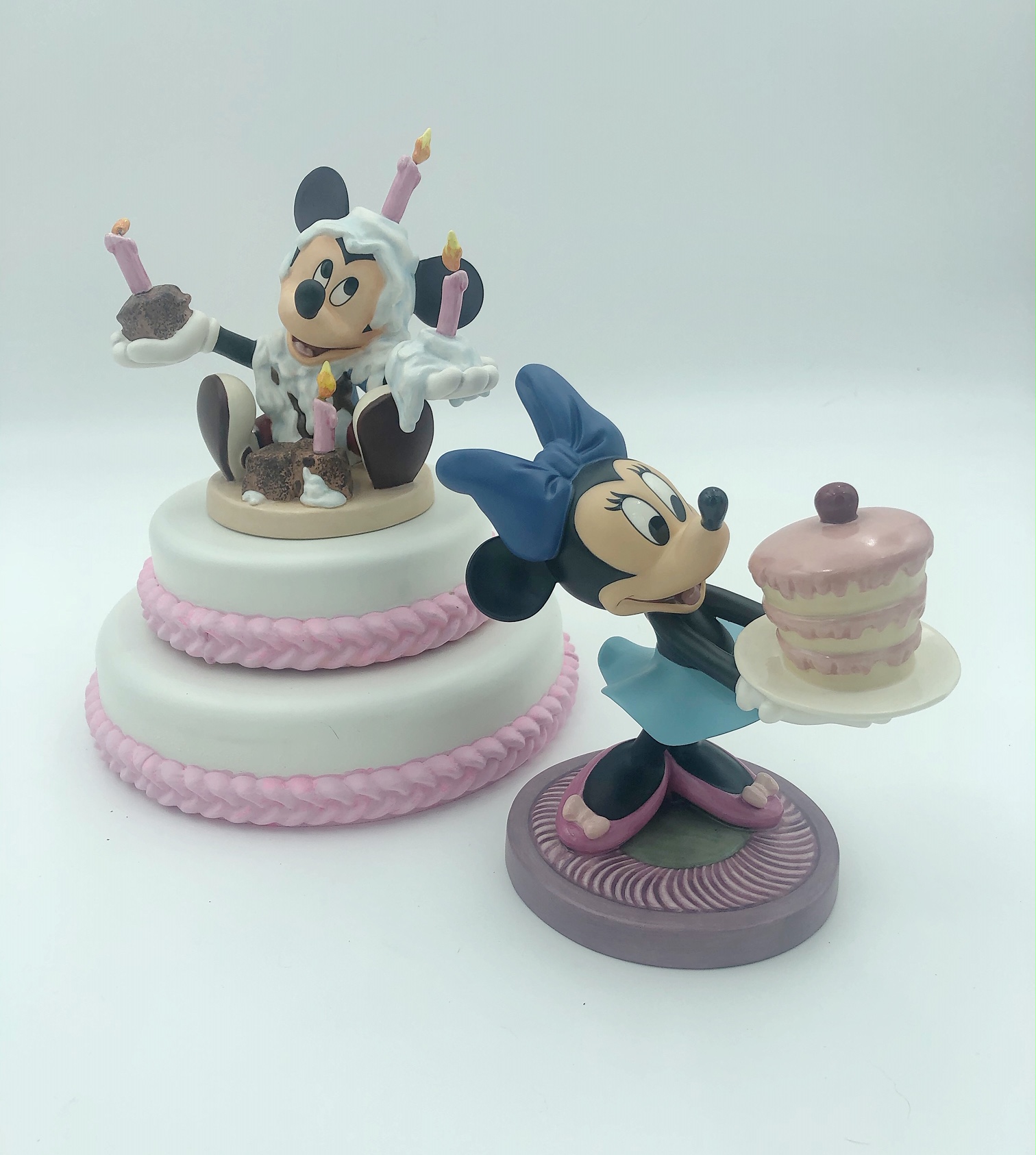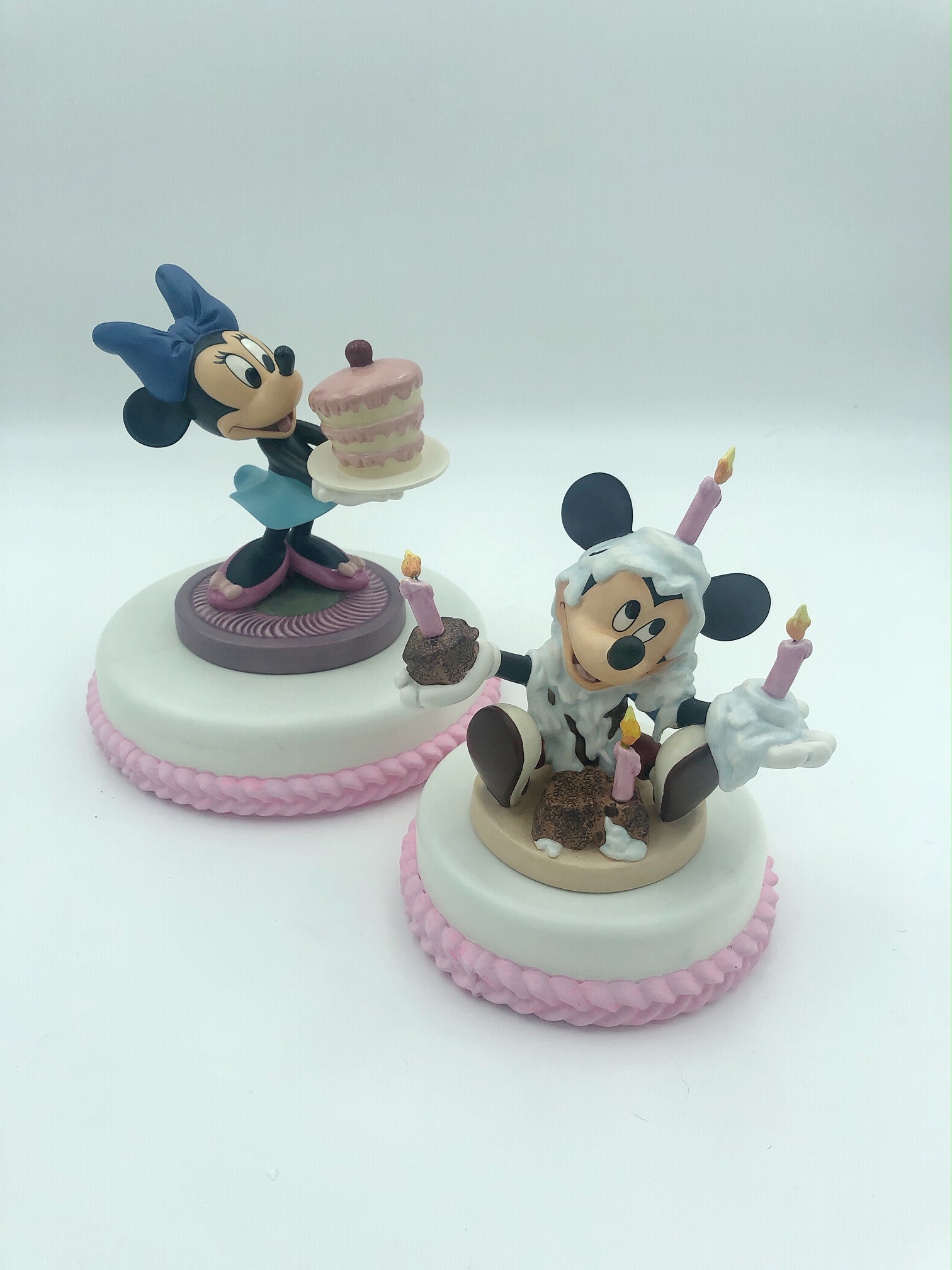 Display Thoughts: This beautiful resin cake and stand looks wonderful with the WDCC Cinderella cake toppers. The small cake is a great place to display your WDCC crystal. The birthday cake fits perfectly with Mickey and Minnie Mouse and can be ordered in with white or pink frosting color.