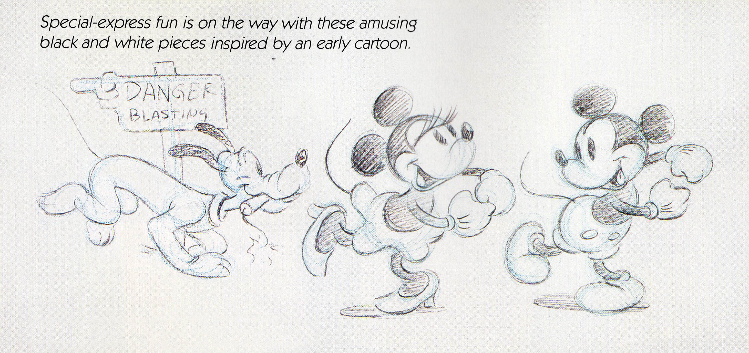 1931: At their flirtatious and mischievous best in this early cartoon, Mickey and Minnie are captured in these scupted tributes to their spunky personalities.