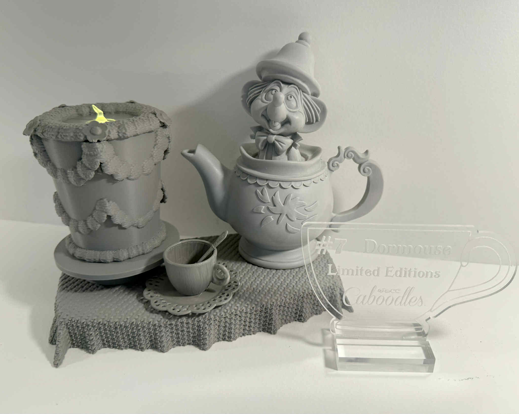 🎉 A toast to nonsense and nap time! 🫖 Our Dormouse has officially arrived at the table — his scene completed with the table, a twinkling un-birthday cake and a perfectly poured cup of tea.